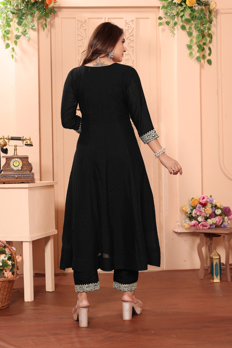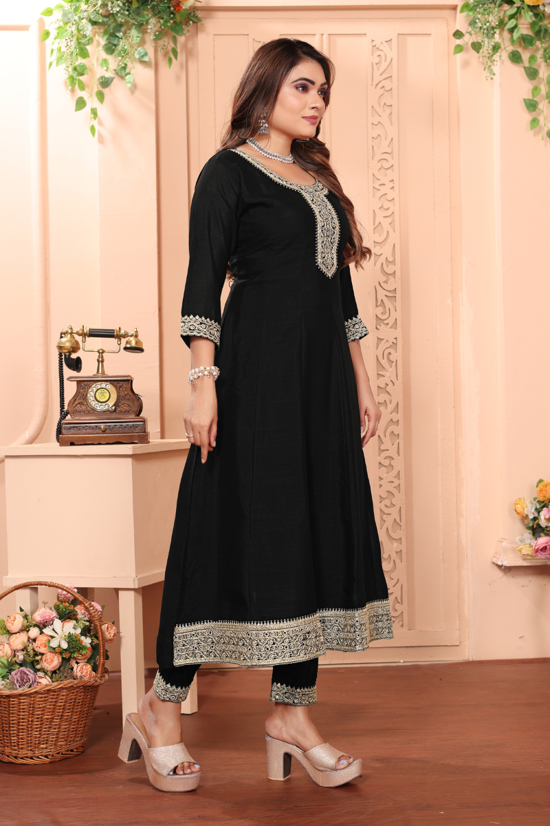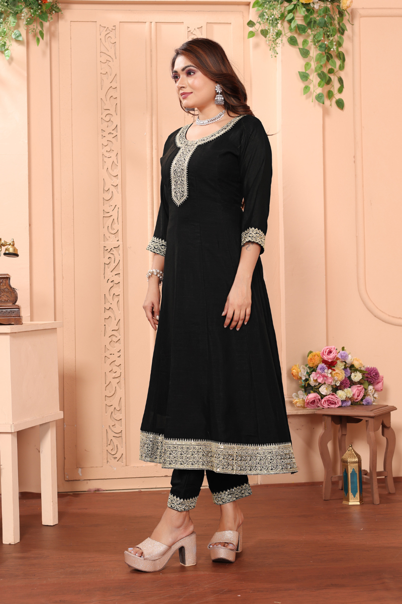 Command attention with the dramatic charm of the BlackGhera Bliss Kurti, crafted from premium Vichitra fabric and adorned with exquisite embroidery.