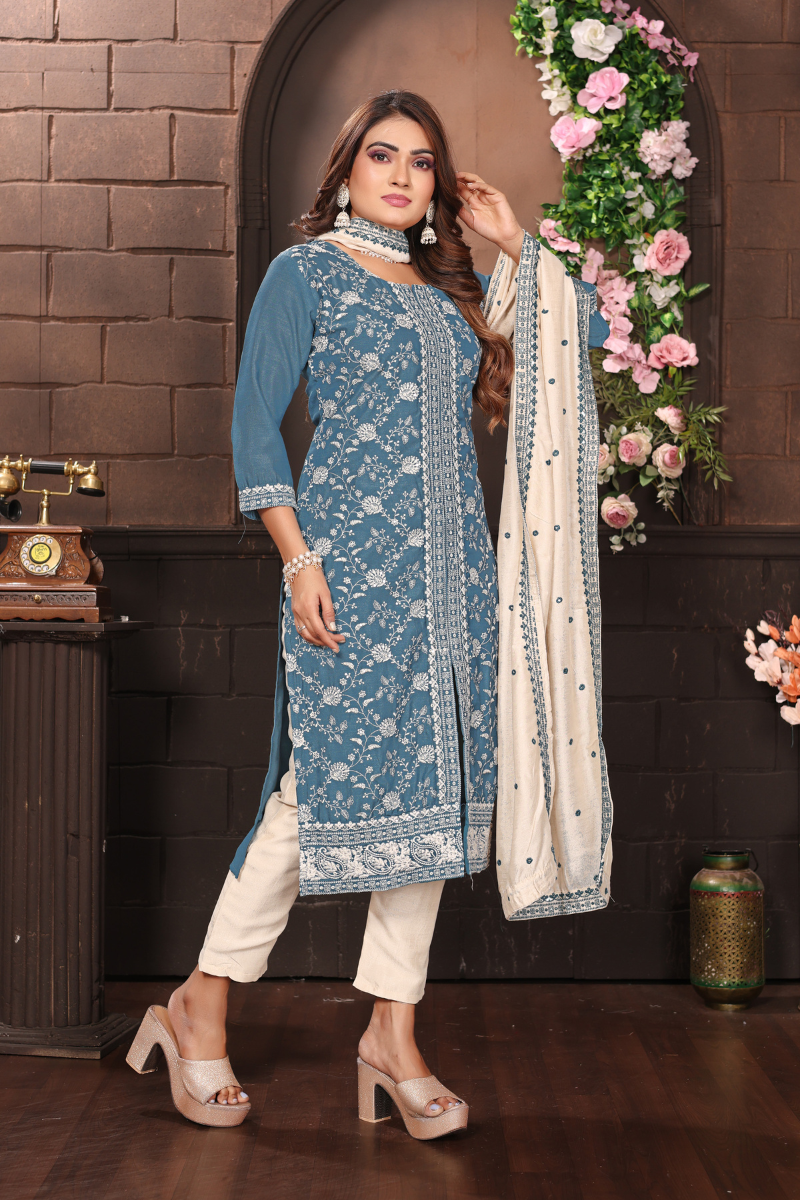 - Premium Vichitra Fabric – Soft, rich texture with graceful drape